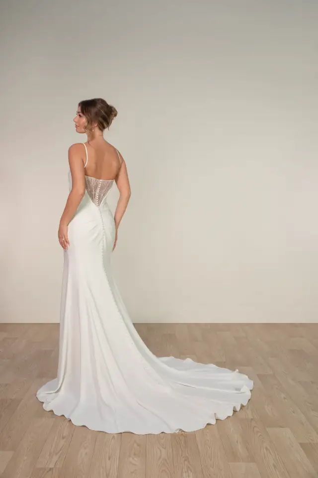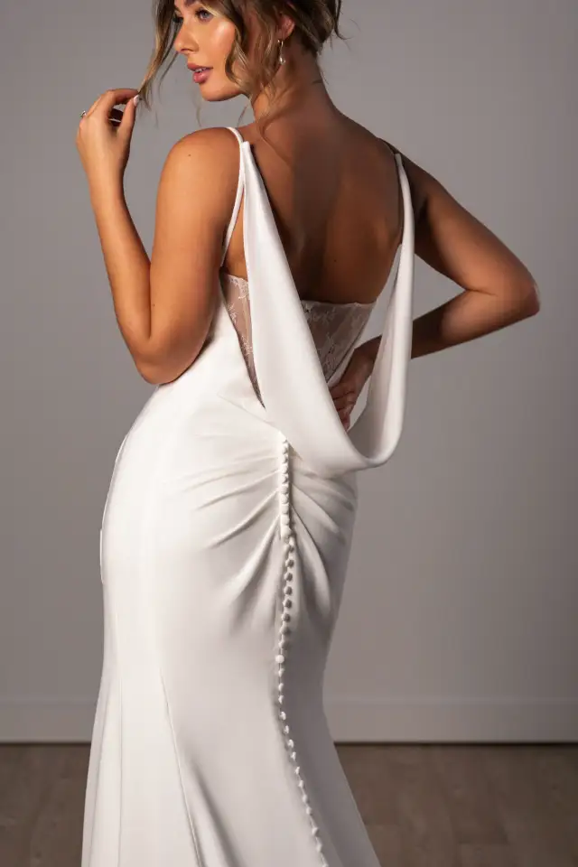 Brook is for the bride who wants to feel like herself on her wedding day - no compromises, no apologies. This stunning crepe sheath dress proves that simplicity can be breathtaking. Delicate spaghetti straps and a softly draped scoop neckline create an effortless elegance, while asymmetrical ruching along the bodice adds beautiful texture that celebrates your natural shape. The detachable cowl at the back? That's your choice - wear it for romantic, shoulder-framing drama or remove it for a sleek, modern look. The column silhouette flows into a sweeping train that commands attention for all the right reasons. Because your wedding dress should make you feel confident, beautiful, and completely you - exactly as you are