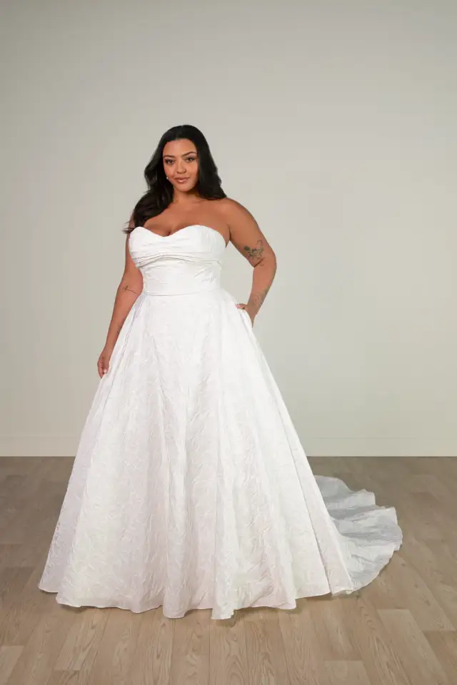 Most wedding dress boutiques order sample dresses in size 10 or 12 or smaller. This means that their gowns only fit brides sized 8 or 10 (crazy eh!). Somerset Bridal is different; we pride ourselves on having the area’s largest selection of modern, contemporary styles in all sizes with over half of our gowns in larger sample sizes right up to a 36. This means that no matter what that silly number on your clothes happens to be you can actually try on wedding dresses to see how they would fit your body.