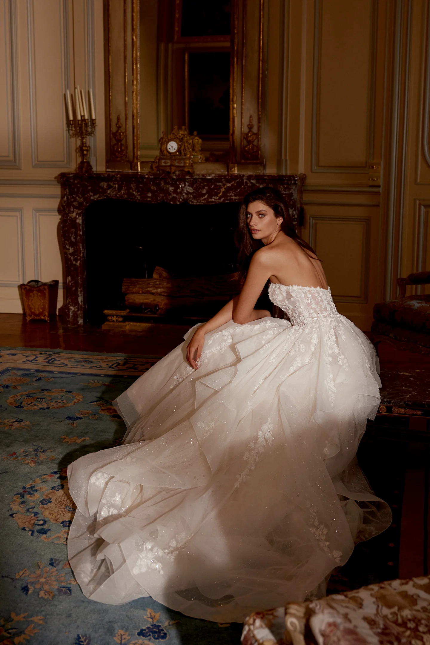 Jaelyn is special: for the bride that walks in and owns the room. The sparkle tulle lights up under every spotlight. The straight strapless neckline keeps the look clean and confident. The illusion bodice shows off your shape with button detail running down the back. The beaded floral appliques give the whole dress a glow. The skirt is the fun part, layers that move with you, horsehair that keeps the shape crisp, and galaxy tulle that catches every bit of light. The chapel train glides behind you and makes every photo stronger.